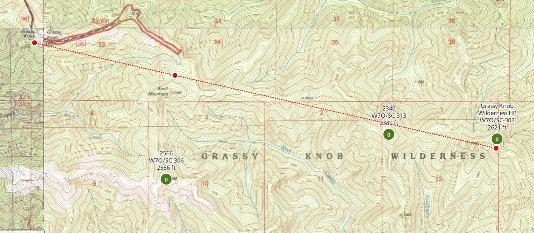 The "easy to reach" Grassy Knob near Port Orford, Oregon is not a summit. Elevation: 2,342' Rise: 442' While the Grassy Knob Wilderness HP about four miles east is W7O/SC-302 and looks like a daunting wilderness bushwhack. Elevation: 2,620' Rise: 880'