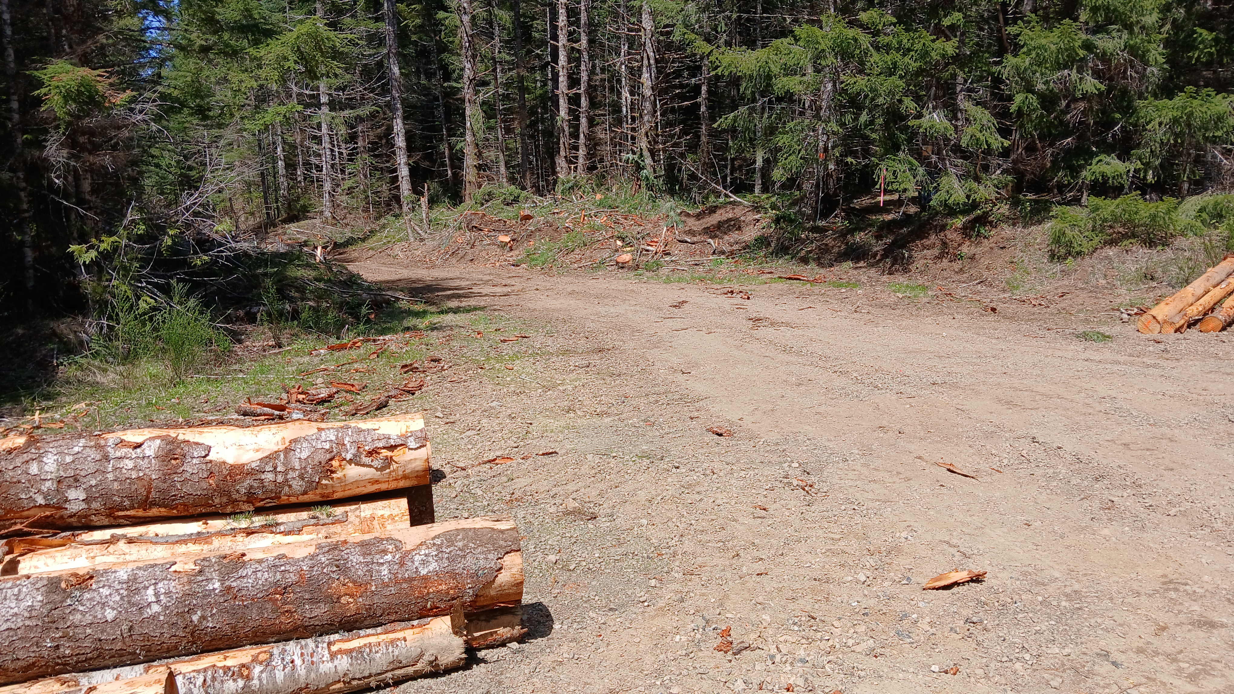 Arrive at a large intersection, make a sharp right turn and park near a new road has been punched through (May 2025 - see photo below). Hike up this road, leaving the new road at a large laydown (camping) area to an abandoned track that ends in a slash pile. Climb over the slash to the apparent high point about 100 meters ahead. Mounts Rainier, St. Helens and Adams can be visible from the high point.
