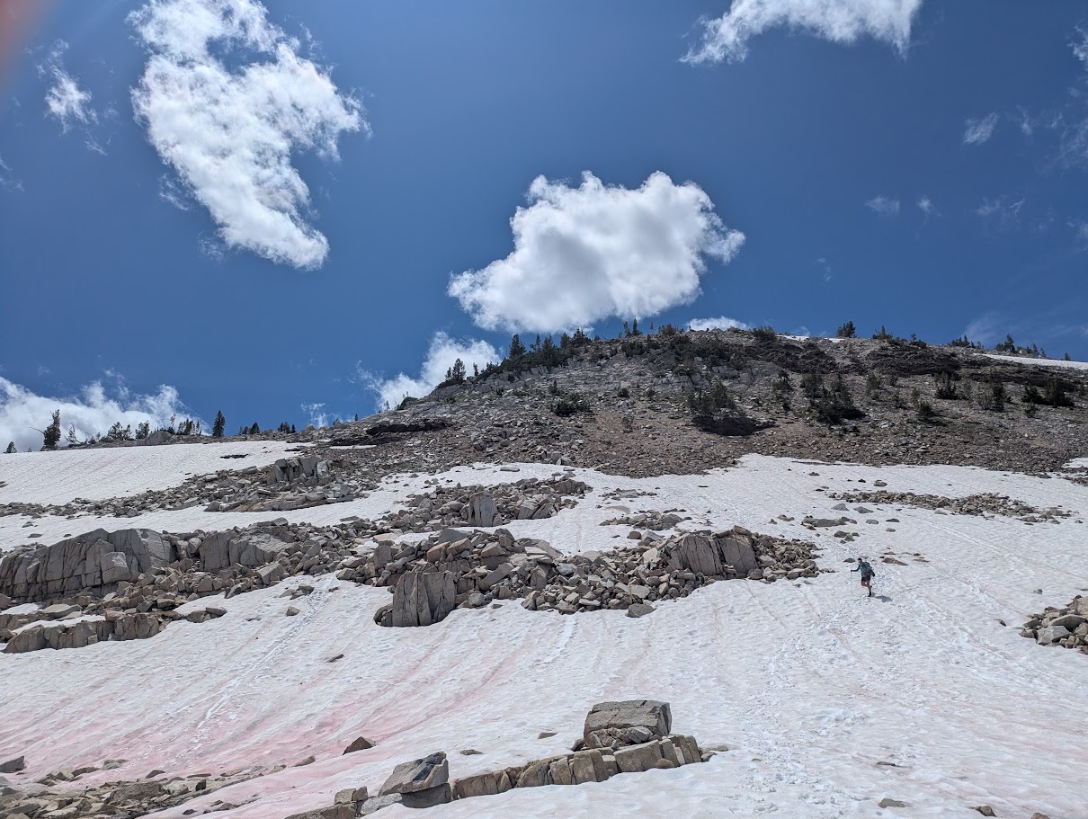 For the most part all of K7ATN's blog post here(http://www.pnwsota.org/blog/k7atn/2019-september-06/eagle-cap-or-septem…) is current and probably some of the best info you're going to get. One thing to note earlier in the summer is the possibility of snow. Unfortunately I don't have a picture of the more direct approach, which I labelled 1 in the map, but much of the trail was under steep snow field. The choices up route 1 were either try to go up a couple hundred yards of steep snow field where you thought the trail went, or go off route and stay on big granite boulder fields for all but about ten yards of front pointing. We chose the second option and it was quite comfortable to the ridgeline. After that there were a few more sections of trail under snow, but none anywhere near as spicy. The picture of my wife decending the snow field is of the line I labelled 2, which had us cross a bit more snow, but at a shallower grade. In either case the ridgeline was totally clean.