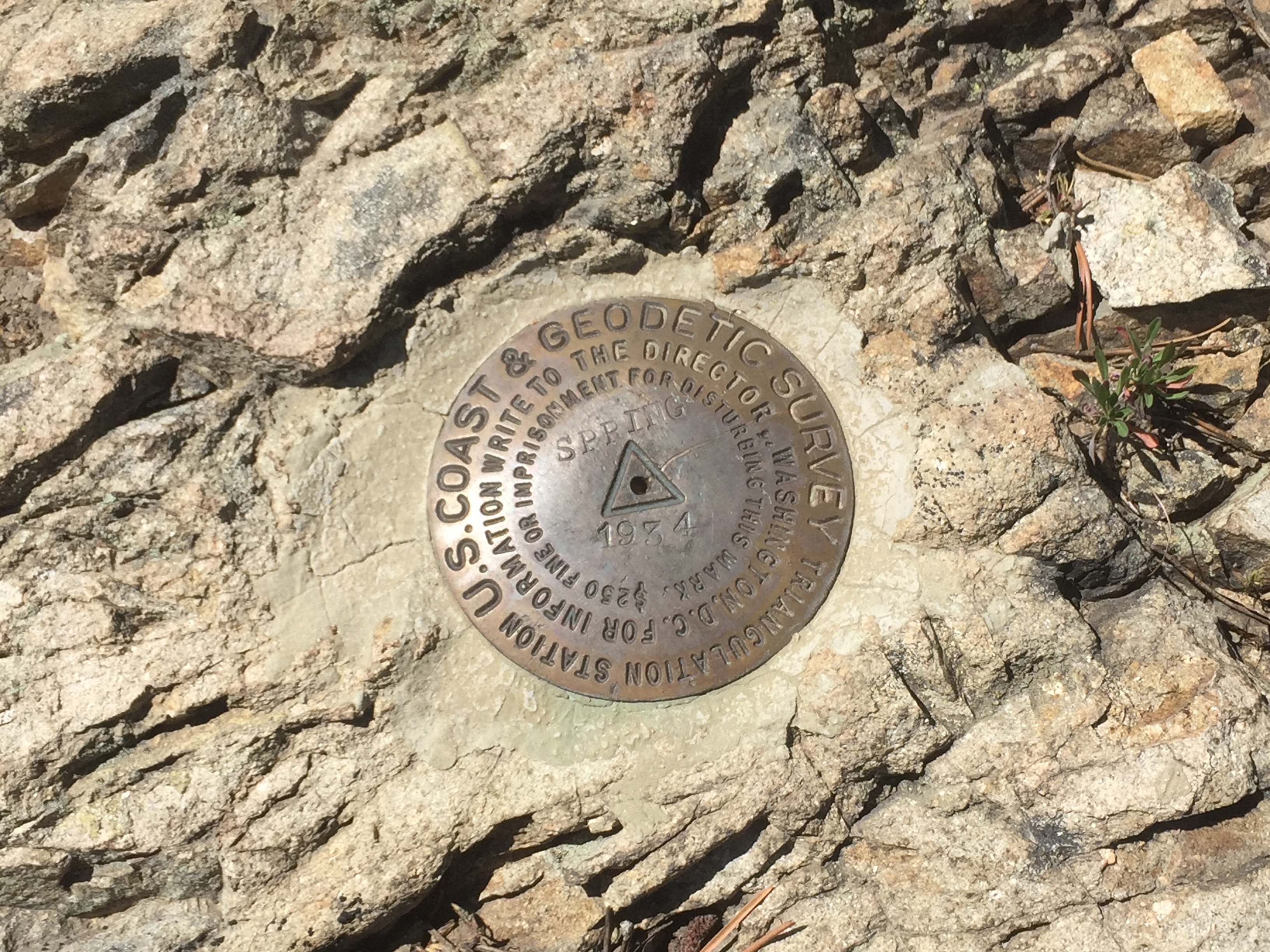 Spring Mountain is an easy hike with only a remnants of a trail through mostly lodgepole pine forest. The summit has a limited views due to tree cover. A USGS monument is cemented in bedrock on the summit.