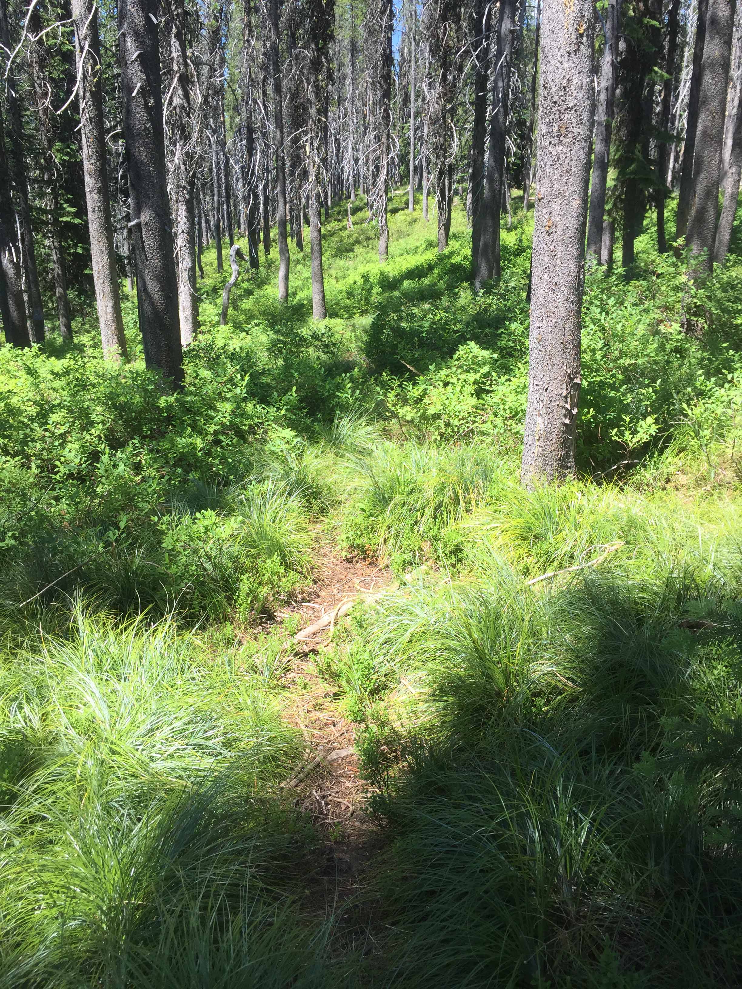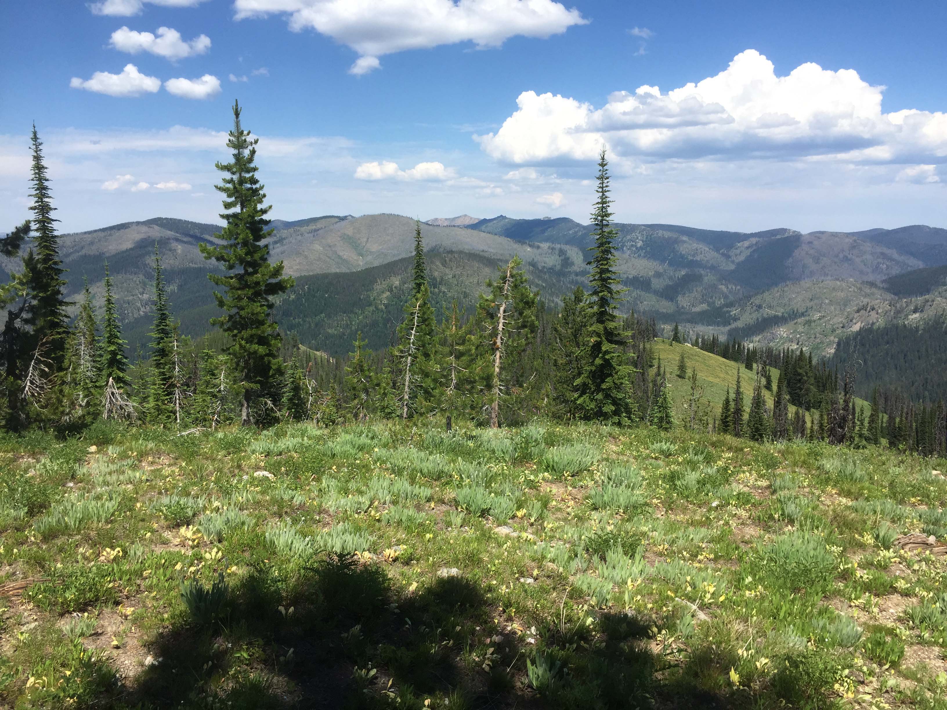 Directions: The vehicle travel destination is USFS #500. A slow mostly narrow US Forest road has often in the summer caravans of all terrain and side-by-side vehicles noisily tracking this route. From Lolo Pass on the Idaho/Montana border travel west approximately 12 miles to FS#569. The road junction is about ¼ mile east of the Powell Ranger Station/Lochsa Lodge access road. Travel essentially north on FS#569 for approximately 6 miles to Powell Junction. Here take FS#500 for another 12 miles to Cayuse Junction. At Cayuse Junction stay on #500 for approximately 4.25 miles to a saddle with parking near the west end of a south facing grassy slope. From here access the ridgeline at the top of the grassy slope and proceed following the high ground to the summit. The first part of the way can be on an old ATV track. A faint unmarked single track trail can be located much of the rest of the way.