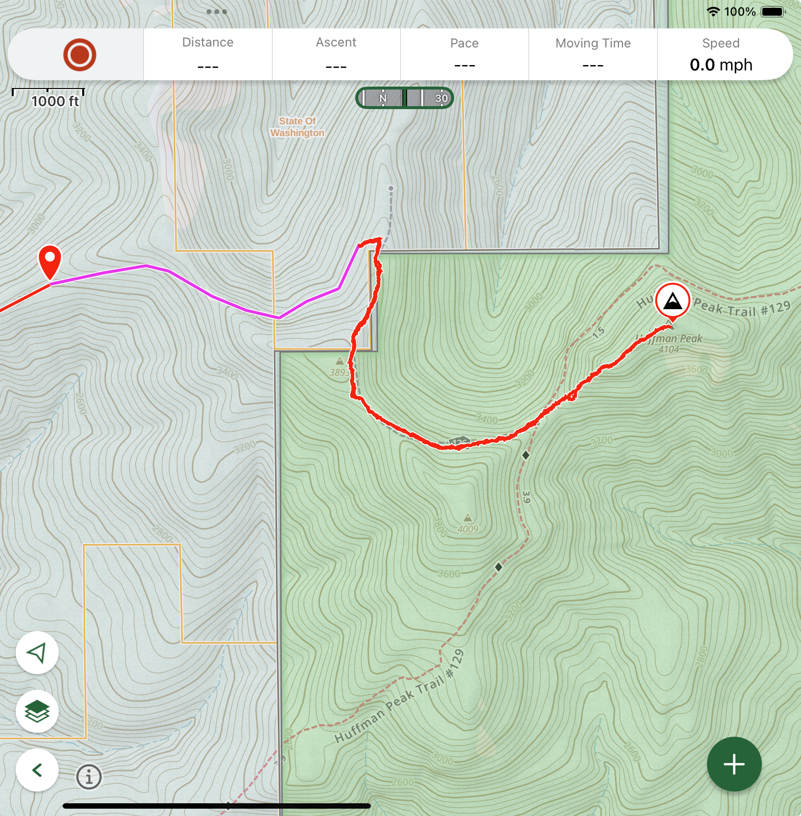 There is a SW “short cut” for Huffman peak by taking the well maintained logging roads in Washington DNR land and following the unmaintained hiking trail 126. 1.5 miles and 1000ft total elevation one way. (Note that there is some up and down here, with 400 ft down included, meaning you’ll have that much on the way back).