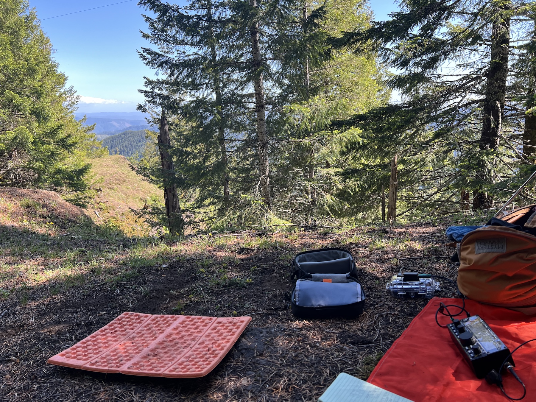 I worked 2m first. I announced the activation on the South Saddle and Mt. Hebo repeaters, but I don’t think I got any takers from those sources. Fortunately, there was cell data service (on the summit only), so I was able to spot myself. I got one QSO from Tualatin, and then with the help of NR7Y’s remote station in Beaverton, I got a couple more. It took a while to find “just the right place” to stand on the summit to make my signal readable, and I was really wishing I had a yagi with me. I then worked HF SSB and FT8, including a summit-to-summit with AG7GP with a signal that was right at the noise floor.
