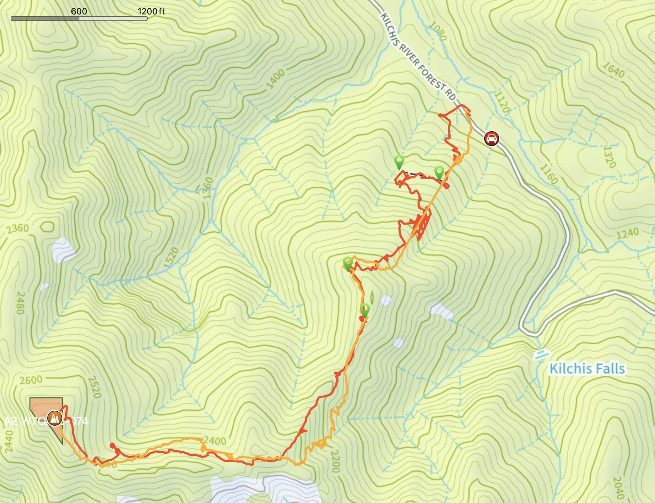 Start by following directions to Cedar Butte, but towards the end don’t take the left turn onto Cedar Butte Road and instead keep heading north on Wolf Creek Road. After about a mile you’ll reach an intersection where you’ll need to make a sharp left onto Kilchis River Forest Road. Follow that for several more miles, and you’ll pass scenic Kilchis Falls on your left. From the falls, it’s under a half mile to where there are a couple good parking spots along the right side of the road. One of them has a large pile of rocks next to it (see photo). There is plenty of level room to pull off the road and park. Total driving distance from Highway 6 to the parking spot was just under 10 miles.
