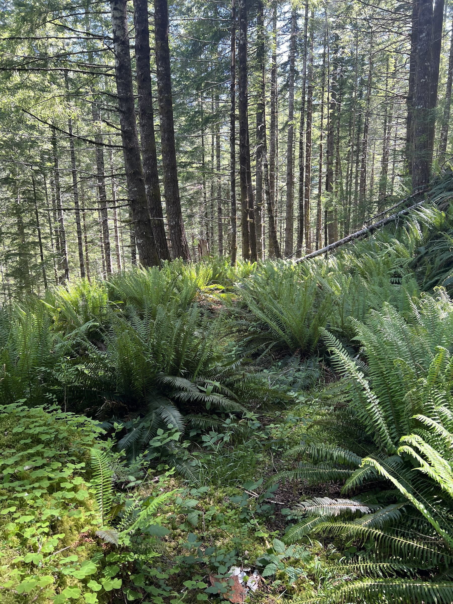 The terrain was generally steep, and if I wasn’t walking up a hill, I was walking at an angle along the side of one. The forest had an undergrowth of ferns – thankfully (once away from creeks) there was not denser brush to contend with. I wore work gloves for the entire hike, and they are an absolute necessity for doing this kind of bushwhack.