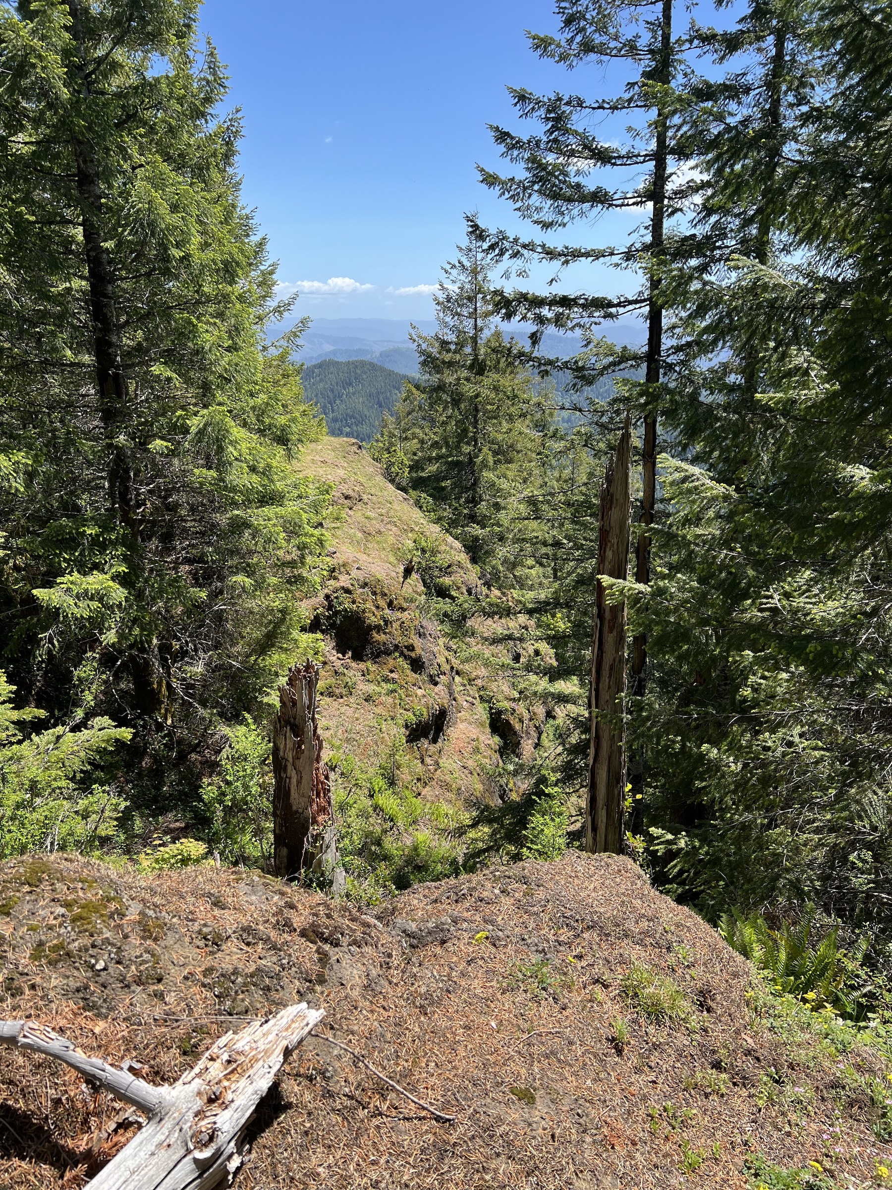 My plan had been to hike from the road up to the nearest peak (around N 45.60302° W 123.65925°) and then follow the ridge up to the main peak. While navigating by using the ridge as a visual landmark was somewhat helpful, alas there was no easy “ridge walk” to be had. Multiple crests along the ridge had rocky faces steeper than I was prepared to tackle, so I wound up hiking around them.