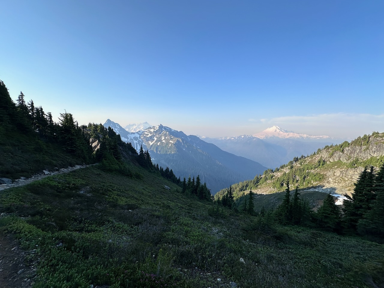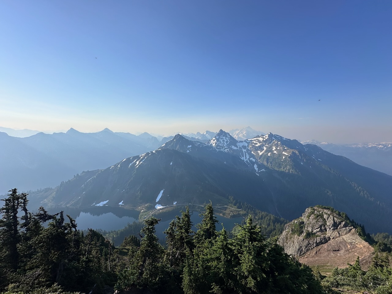 The weather was cool and clear, providing remarkable views despite the encroaching smoke from fires in the east. From both summits, I enjoyed stunning overlooks of Twin Lakes below, framed by the majestic North Cascades.