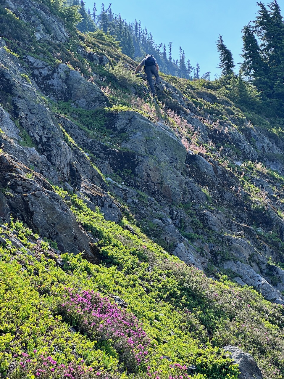 Trail Description: The hike to 30.06 Peak (Bear Mountain) is a steep, off-trail alpine scramble just over a mile from the Twin Lakes parking area, gaining over 1500 feet of elevation. The final ascent includes an easy class 2 scramble to the summit.