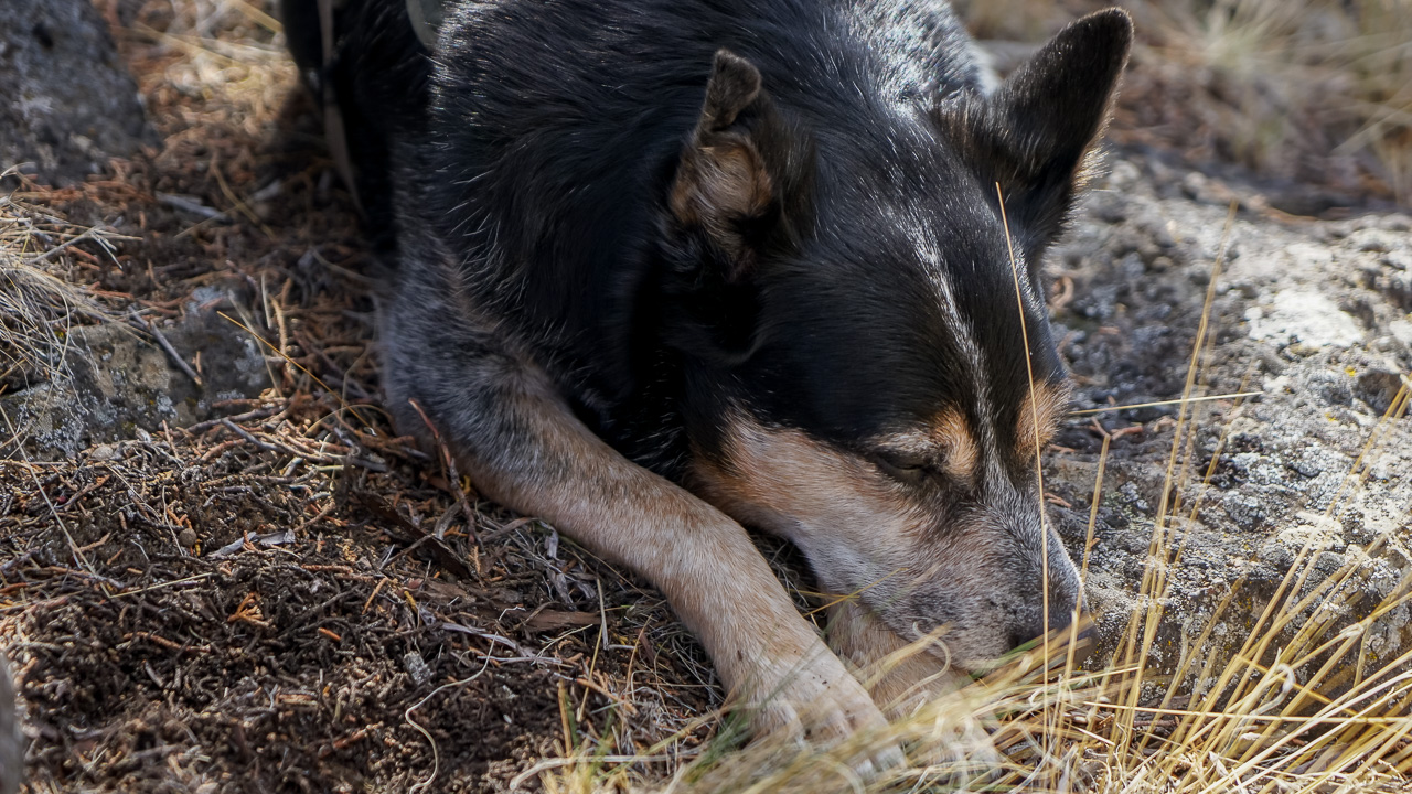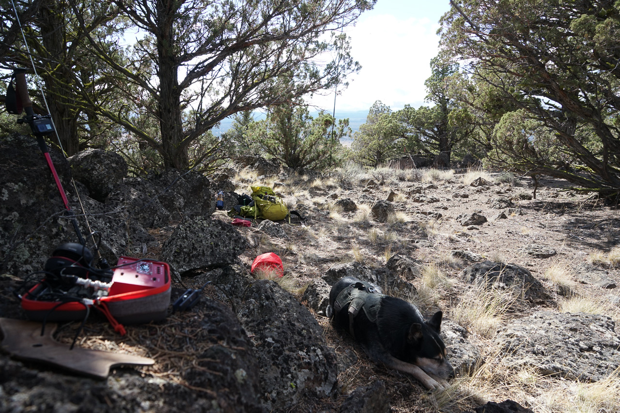 Horse Ridge sits in public land, and I was determined to get the activation. I ended up parking on the West side of the mountain at 43.88112, -121.08090. Note: there is a shooting range here and if other people are in the area, it probably isn't a good idea to hike up this way. Roscoe and I bushwacked up the mountain. It was steep, punchy, and after being cold all morning, hot. This is high desert terraine. It was odd, being hot and then looking at the storms to the west and seeing snow dumping in the Cascades and Paulina Peak.