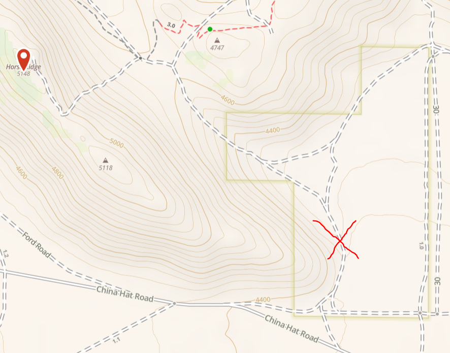 An outing to Pine Mountain offers an opportunity to activate 3 summits: W7O/CE-058, W7O/CE-068, and W7O/CE-176. After Pine Benchmark, I drove back to HWY 20 and headed west. I turned left on Spencer Wells Rd to head towards the OHV area. This summit was a bit of a weird one. There is a road all the way to the top. My efforts to get TO that road were thwarted by private property and no tresspassing signs. Perhaps it is possible to reach that road and take it up, but I was unsuccessful today. See map below for no access road.