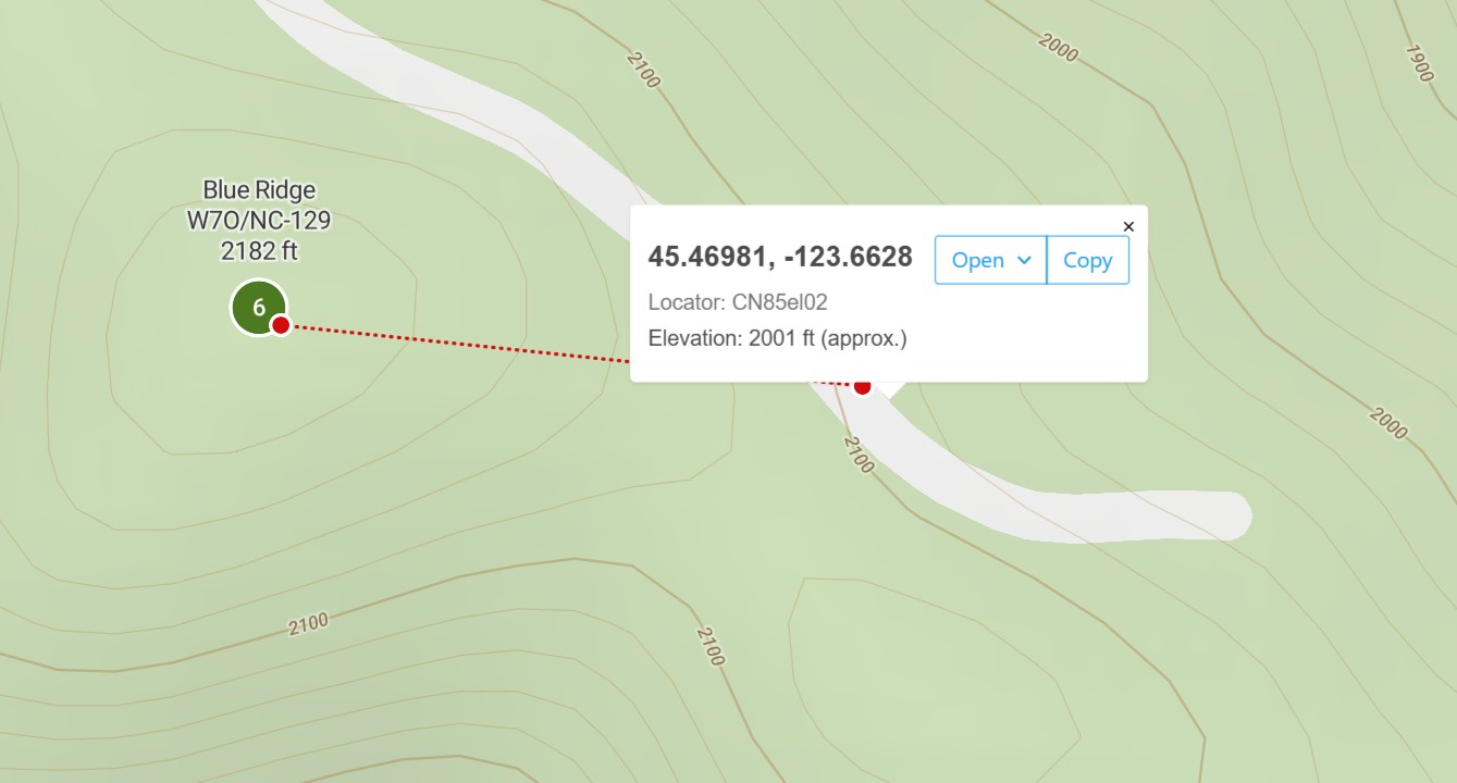 The new peak is a bit easier to attain as there is a road from the parking area to the new peak which is in the opposite direction of the old. This road may be driveable, but when Dave, N7LKL, and I were there it was covered in 8 inches of snow, and we had actually snowshoed from about the 1100 foot level. In any case, it is a short walk of less than 0.5 miles OW to the top from what I would call the turn around/parking area (45.4721, -123.6669). We walked up the road 0.2 miles and then bushwhacked our way to the top.